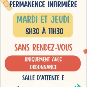 - Consultation infirmière sans rendez vous- Nouveau à la Maison de Santé. En plus de leur permanence habituelle, l’équipe infirmière vous accueille dorénavant sans rendez-vous les mardi et jeudi de 8h30 à 11h30 , salle d’attente E. Pour les soins avec prescription suivants:…